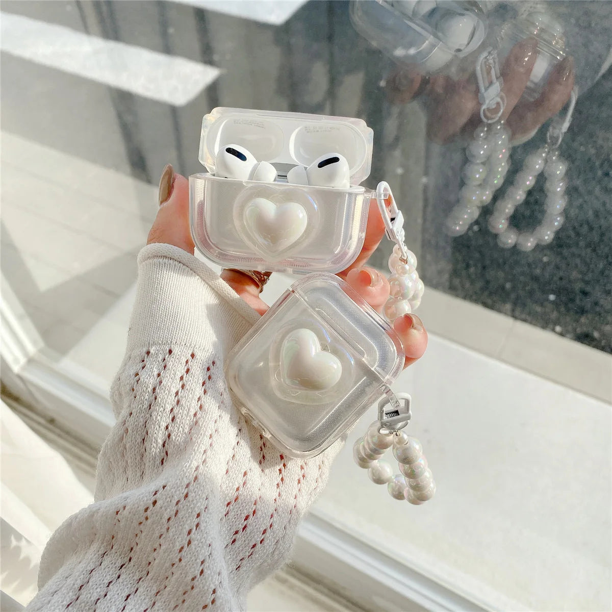 Simple Laser Pearl Heart Earphone Case for AirPods 2 Pro 3 Generation Headset Charging Box Protect Cover for Air Pods Keychain
